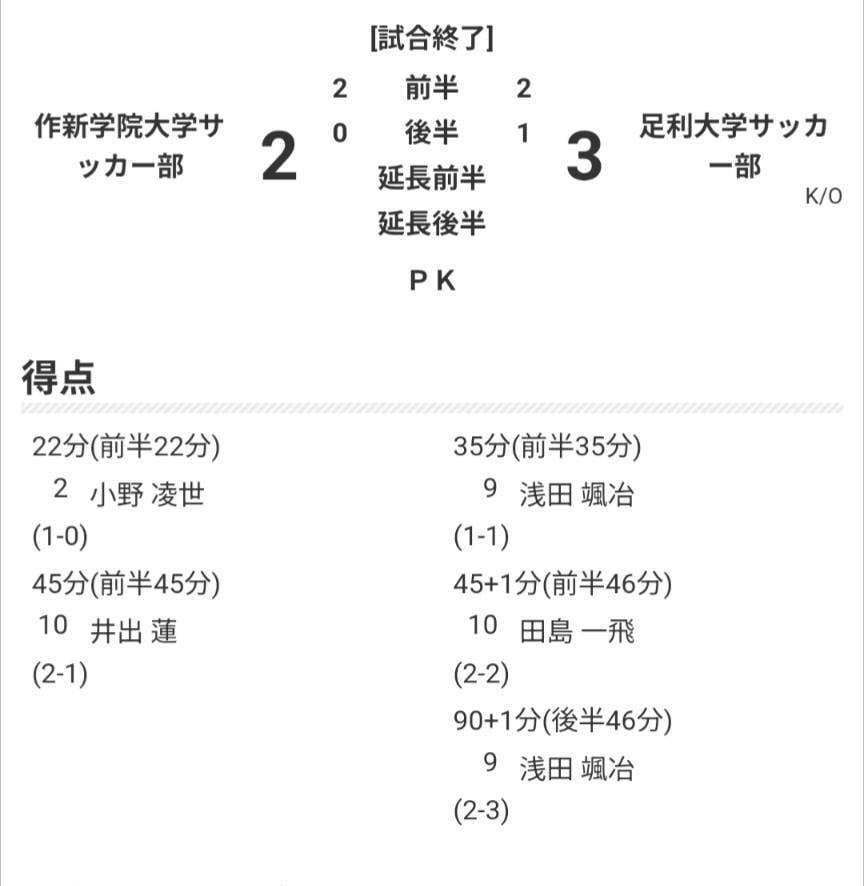 大学部 2025 活動方針(click) 〔大学部長〕 谷 田 部 將 司 2025年度 2024年度 足利大学がNEZASカップ決勝トーナメント準決勝進出! 足利大学サッカー部が3月30日、天皇杯の栃木県代表を決定するNEZASカップの決勝トーナメントで作新学院大を3−2で退け準決勝進出を決めました。2−2の終盤アディショナルタイムで決勝点を挙げ試合を決めた。準決勝は同日史上初のJ3栃木ダービーで栃木SCに引き分けた栃木シティFCと4月27日対戦する。(写真提供:立川様) ページトップへ 更新履歴 2025 12/21 トップページ、少年部、社会人更新 12/4 女子部、高校部、中学部、シニア部更新 11/3 ホームトピック更新・高校部・社会人部・女子部更新 8/ 3 社会人部、女子部。少年部、中学部、幼年部更新 5/24 2025年度活動指針更新・評議員会開催報告 5/18 高校部・幼年部・少年部更新 4/18 足利市サッカー協会令和7年度 評議員会開催のお知らせ 4/18 2025年度 足利市ジュニアスポーツ教室 「サッカーコース」開催のお知らせ 3/31 足利大学サッカー部がNEZASカップ準決勝進出! 3/15 足利大学サッカー部がNEZASカップ決勝トーナメントに進出! 3/2 足利市少年サッカー大会12結果掲載 2/27 普及委員会 巡回教室更新 2/9 MBS親子ミニサッカー結果掲載 1/26 社会人部市民選手権結果掲載 1/26 事務局更新 1/23 普及委員会 巡回教室更新 12/15 普及委員会 巡回教室更新 足利市少年サッカー新人大会兼JA足利杯結果掲載 高校部市民選手権大会結果掲載 10/16 足利キッズサッカーフェスティバル記事掲載 9/29 市民選手権大会U-12の部開催 9/28 足利・両毛ローザFCがフットサル県大会で優勝し関東大会進出決める 9/22 中学部新人大会結果掲載 少年U-10足利市民選手権大会結果掲載 9/11 幼年部足利市民選手権大会結果掲載 7/17 足利市少年サッカー大会U11結果掲載 中学総体足利予選会結果掲載 6/15 足利大学学長杯結果掲載 6/2 足利市少年サッカー大会U10結果掲載 5/31 MUNDIAL ASHIKAGA大会結果掲載 5/3 マクドナルドキッズカップ結果掲載 3/31 JFAキッズサッカーフェスティバル開催 2/11 社会人部更新( 市民選手権結果) 女子部更新(県高校サッカー新人大会結果) 普及委員会更新( 巡回サッカー教室更新)( 1/31 幼年部 MBS親子ミニサッカー入賞者掲載 1/25 事務局 令和6年度足利市サッカー協会登録関係書類掲載 2023 11/12 中学部協会長杯結果掲載 10/25 2023年度 保育園・幼稚園・小学校 サッカー巡回教室スタート 10/25 幼年部 よみタイリーグ結果掲載 10/25 シニア部 市民選手権結果掲載 10/8 市民選手権大会少年部U-12結果 9/24 市民選手権大会幼年部結果、栃木県中学校新人サッカー大会 足利地区予選会結果掲載 9/17 中学部市民選手権結果掲載・サッカーフェスティバルの様子(少年〜社会人)掲載 9/3 サッカーフェスティバル(幼年部)結果掲載 8/20 少年部U10市民選手権結果、サッカーフェスティバル(シニア&女子)掲載 7/8 社会人部 県南五市対抗親善総合競技大会で準優勝 6/19 大学部・幼年部 足利大学長杯結果掲載 6/19 大学部 アミノバイタルカップ第12回関東大学サッカートーナメント1回戦結果掲載 6/10 少年部 第20回足利市少年サッカー大会U-11結果掲載 5/31 幼年部、少年部、普及委員会更新。 令和5年度活動指針更新 3/26 シニア部市民選手権大会結果掲載 2/26 高校部市民選手権大会結果掲載 2/26 幼年部マクドナルドキッズカップ結果掲載 1/28 MBS親子ミニサッカー結果掲載 11/23 全日本U-12栃木県大会で御厨FCが3位入賞 11/13 足利市サッカー協会長杯(中学部)が開催されました。 11/13 よみタイリーグ2022(幼年部)が開催されました。 9/19 足利両毛ローザFC県選手権で優勝 市民選手権大会Uー10結果掲載 9/6 栃木シティ公式戦(9/10)観戦選手(少年部)サッカースクールのお誘い(TOPページtopic1) 8/28 いちご一会とちぎ国体、いちご一会とちぎ大会応援広告掲載について(事務局) 6/14 県中学校春季体育大会サッカー大会で西中準優勝記事掲載 6/14 足利市少年サッカー大会結果掲載 6/5 足利大学学長杯結果速報掲載 4/4 2022年度 足利市ジュニアスポーツ教室「サッカーコース」開催のお知らせ 3/23 令和4年度 協会登録関係資料アップしました(事務局) 3/17 2021年度栃木県クラブユース連盟の総会で、足利両毛ユナイテッド3選手が賞を受賞。 1/8 県のグラスルーツ委員会主催 ウォーキングフットボールのご案内 12/25 足利両毛ユナイテッド下野杯準優勝 10/23 三重・山前FC U-10が栃木県の頂点! 8/7 サッカーフェスティバル中止のお知らせ 6/17 2021 活動方針ほか更新しました。 6/17 足利大学長杯(幼年)、U-11大会(少年)結果掲載 5/13 2021年度評議員会DL資料掲載 5/13 2021年度登録関係DL資料掲載 5/3 マクドナルドキッズCUP延期案内 4/5 足利市ジュニアスポーツ教室(サッカー)開催案内掲載 3/29 マクドナルドキッズCUP開催案内掲載(TOP) 2020 11/18 足利両毛ユナイテッドFC関東大会へ出場 K-WESTが県8強 6/22 協会情報更新 5/16 評議員会案件資料DLサイト(14日間期間延長) 5/15 2020年度 登録関係ファイル全ファイルアップ(事務局) 5/2 評議員会書面評決案件資料DLサイト案内(事務局) 4/29 2020年度 登録関係ファイル一部