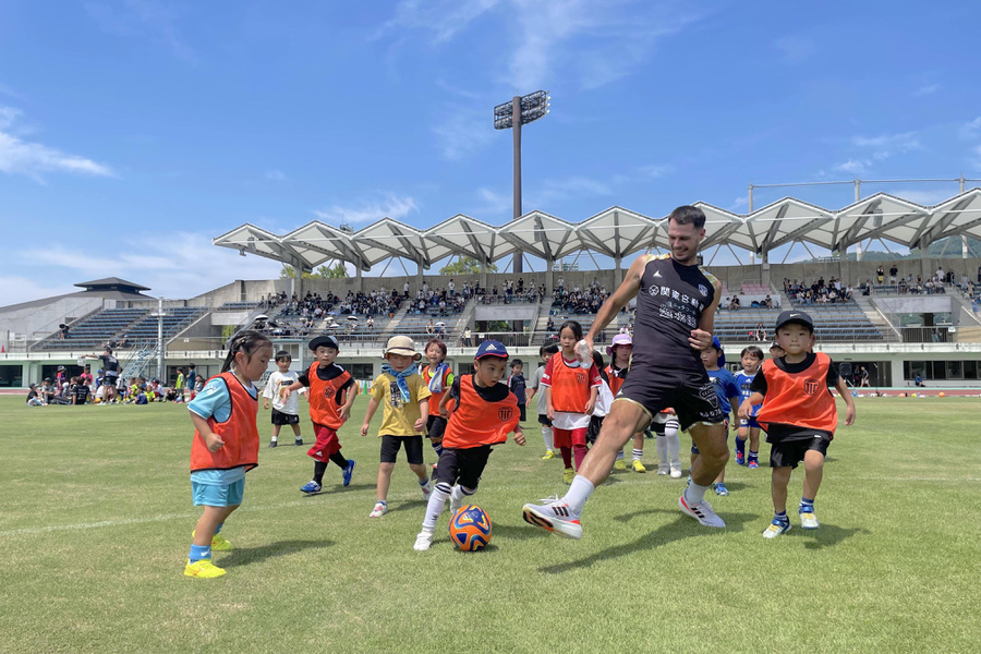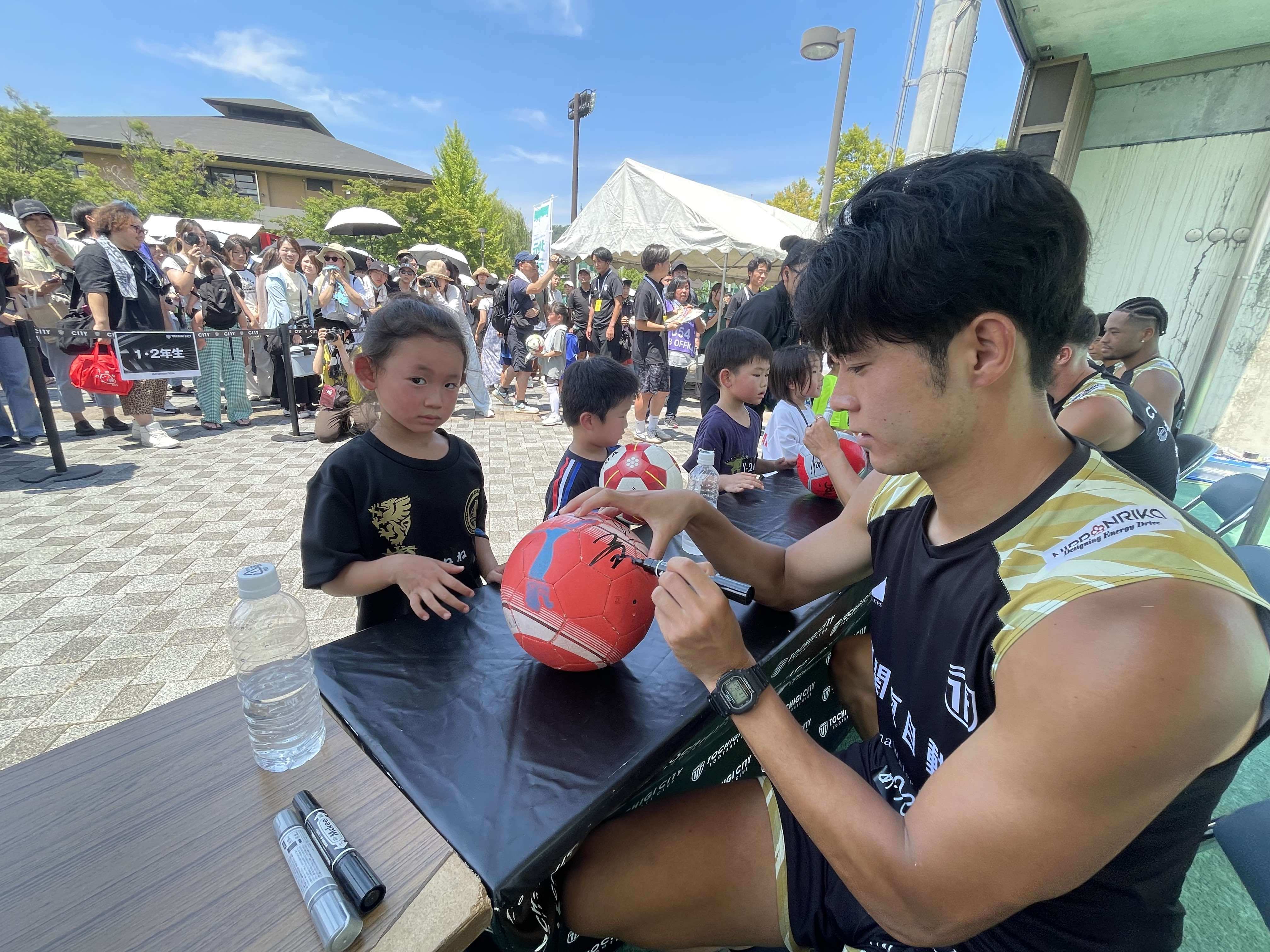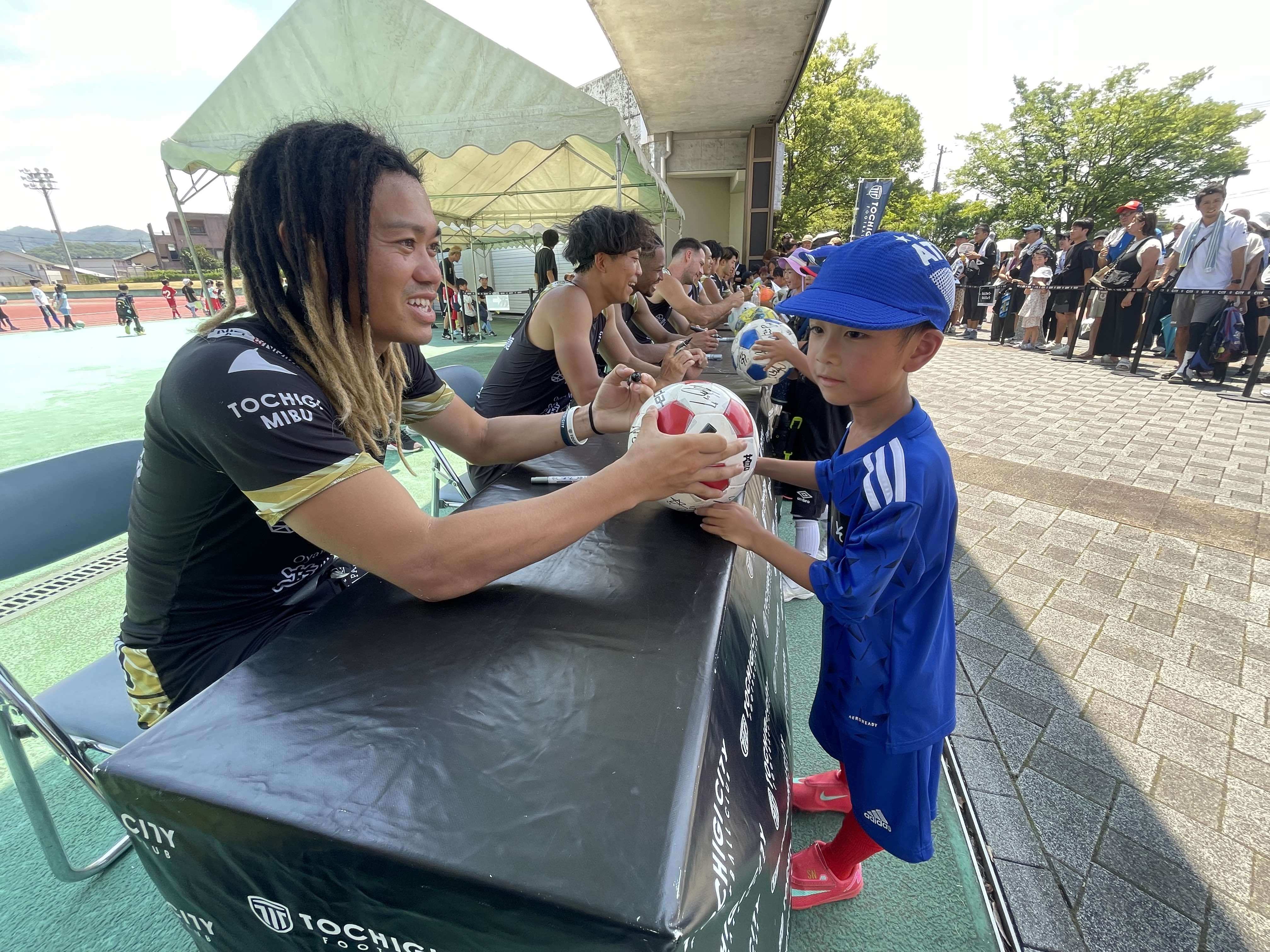 この日は、J3栃木シティの選手が幼年〜小学6年生までの子どもたちに指導。参加者は田中パウロ淳一や平岡将豪、森俊貴など主力選手とともに爽やかな汗を流しサッカーを楽しんだ。最後にはサイン会も行われ、子どもたちは思い思いに持ち寄ったボールやシャツなどに選手からサインをもらい笑顔を見せる場面も。正午からはJ3栃木シティvs栃木シティU25の公開トレーニングマッチが行われ、子どもたちはメインスタンドに詰めかけたサポーターとともにプロの試合を興味深く観戦した。